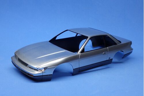 こんばんは。 シルビアの続きです。 前回のボディの課題の「Q's」のバッジと2トーン塗装境目のストライプの再現を進めていきましょう。 先ずは、ボディの進行状況の写真から。 自作「Q's」バッジとストライプのデカールを貼ったところです。 では、製作手順…