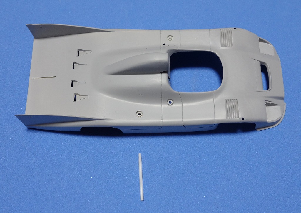 サーフェーサー吹きの後、そのまま塗装に入ろうかとも思いましたが、ボディ一体の燃料給油口のモールドが気になるのでもう少し手を入れることにしましょう。