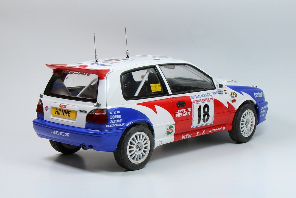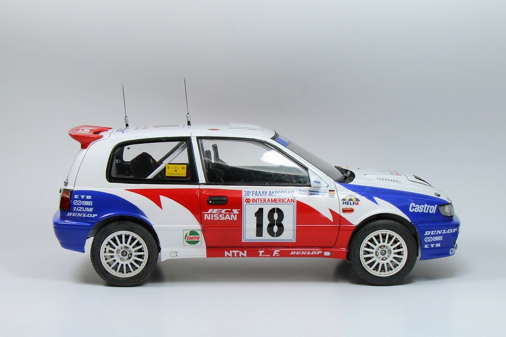 キットは前回の市販車バージョンの派生キット(こちらが本命でしょう)ですが、市販車バージョンの際にも述べたように窓枠のモールド以外は特に大きな問題も無く、スムーズに組み上げられます。手を入れるべきところも少ないので、気になるアンテナ線の太さの解消のため、洋白線でスリム化して実感を高めてみました。また、ラリーカーとしてはボックスの実車写真にもあるように前後輪のマッドフラップが付いていた方がより実感が高まりますね。ランチアデルタのようにマッドフラップパーツを付けてくれればありがたいですね(-->ハセガワさん)。