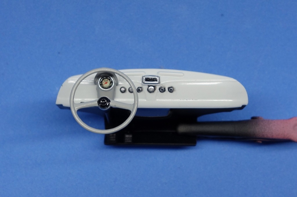 ダッシュボード面はボディ色(LP-39レーシングホワイト)、ハンドルとメーター枠部分はガルグレー(#315 グレーFS16440)で塗装しました。